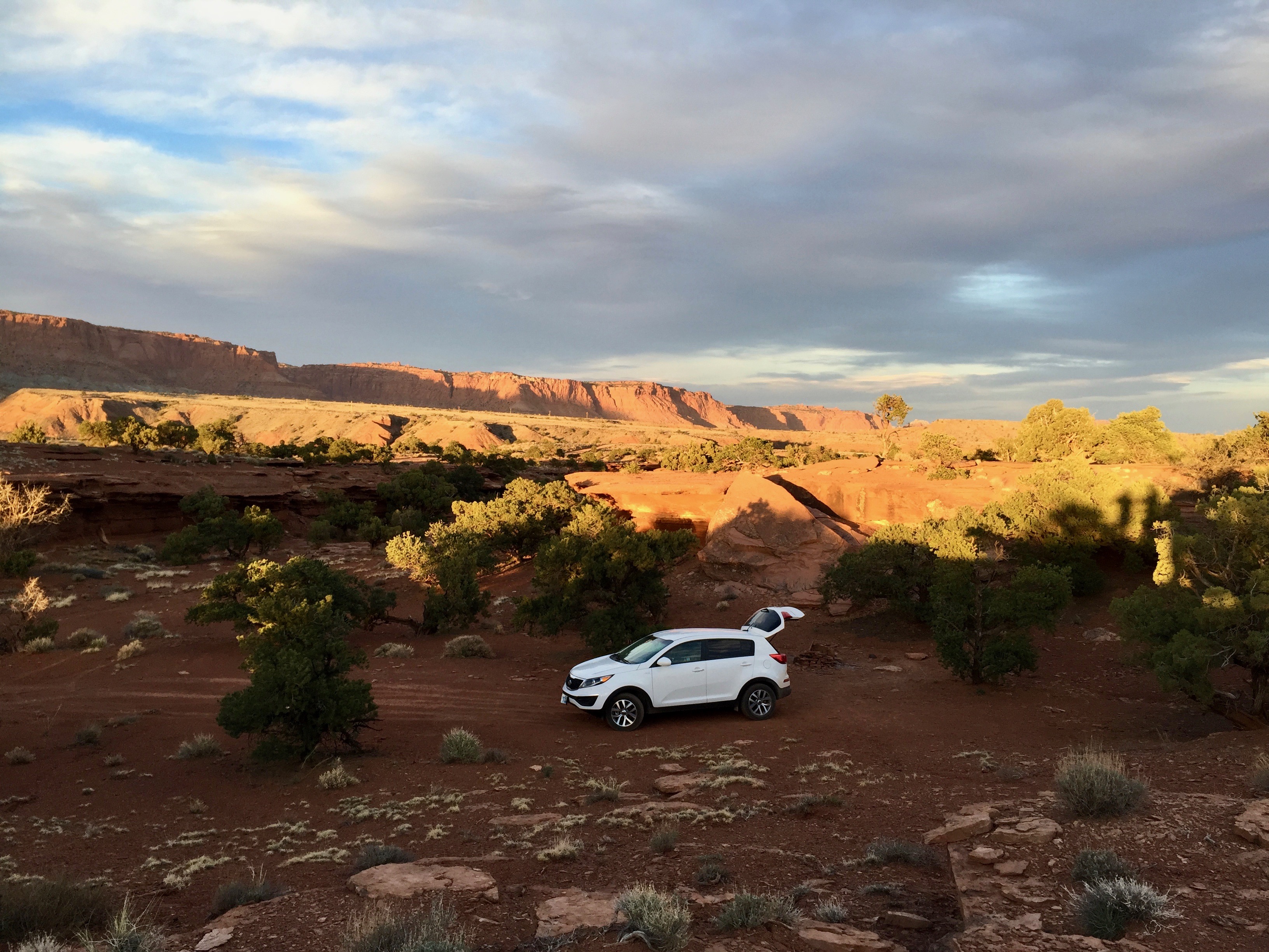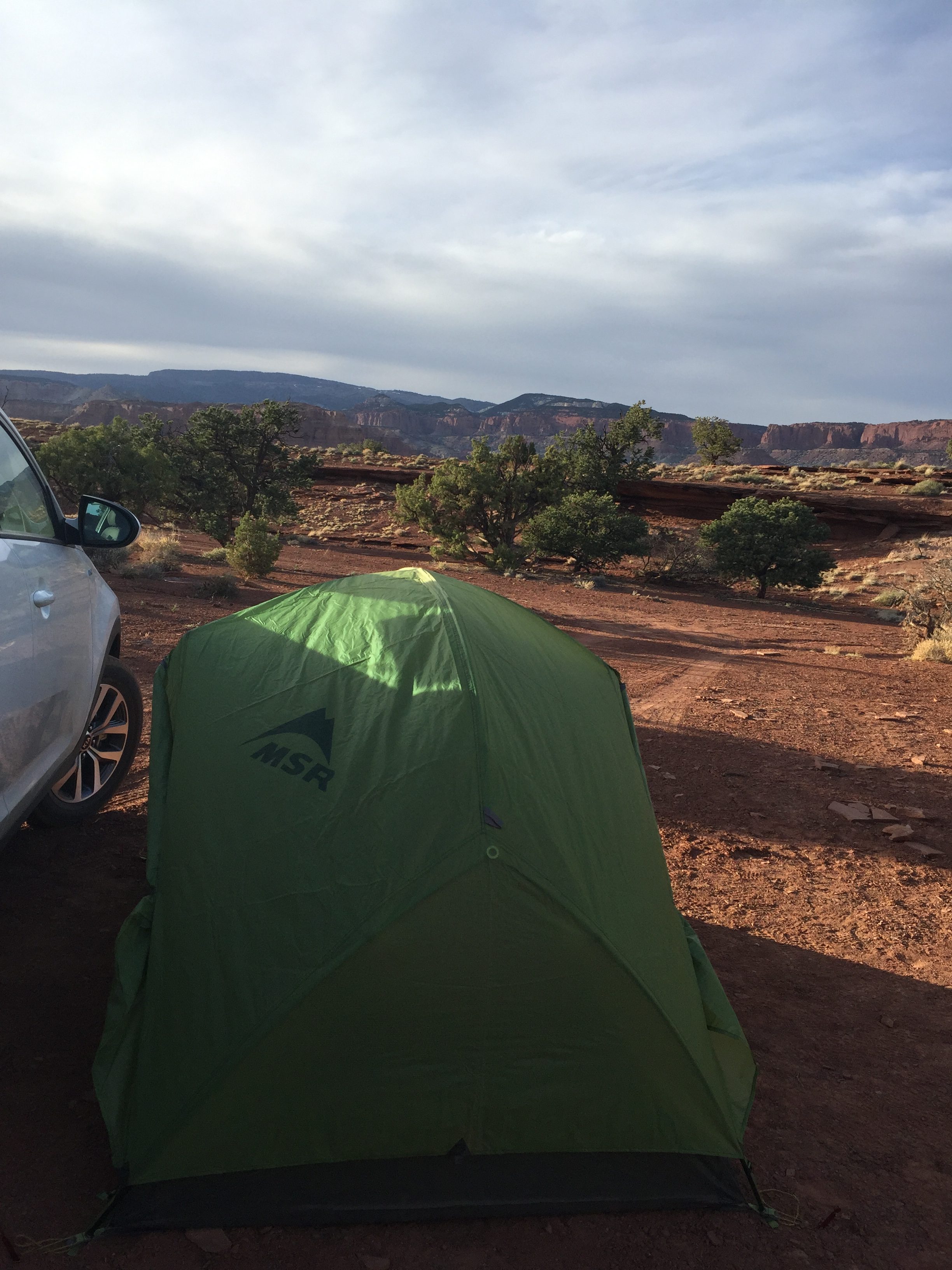 We decided to camp for our one night stay. Our original plan was to camp at Fruita Campgrounds inside the park which only charged $10 for the night, but did not take reservations. Unfortunately, we got there just as they were full. If you want to get a spot in the established campgrounds be sure to arrive early in the day as the previous day’s campers are departing. We drove around looking for alternative campgrounds but there was nothing available. So, we ventured off the main road along a dirt road onto BLM public land (Bureau of Land Management) and found a nice little area to camp just outside of the park. We promise, our picture below is not an ad for the rental car! We parked our car and set up our tent right beside it.