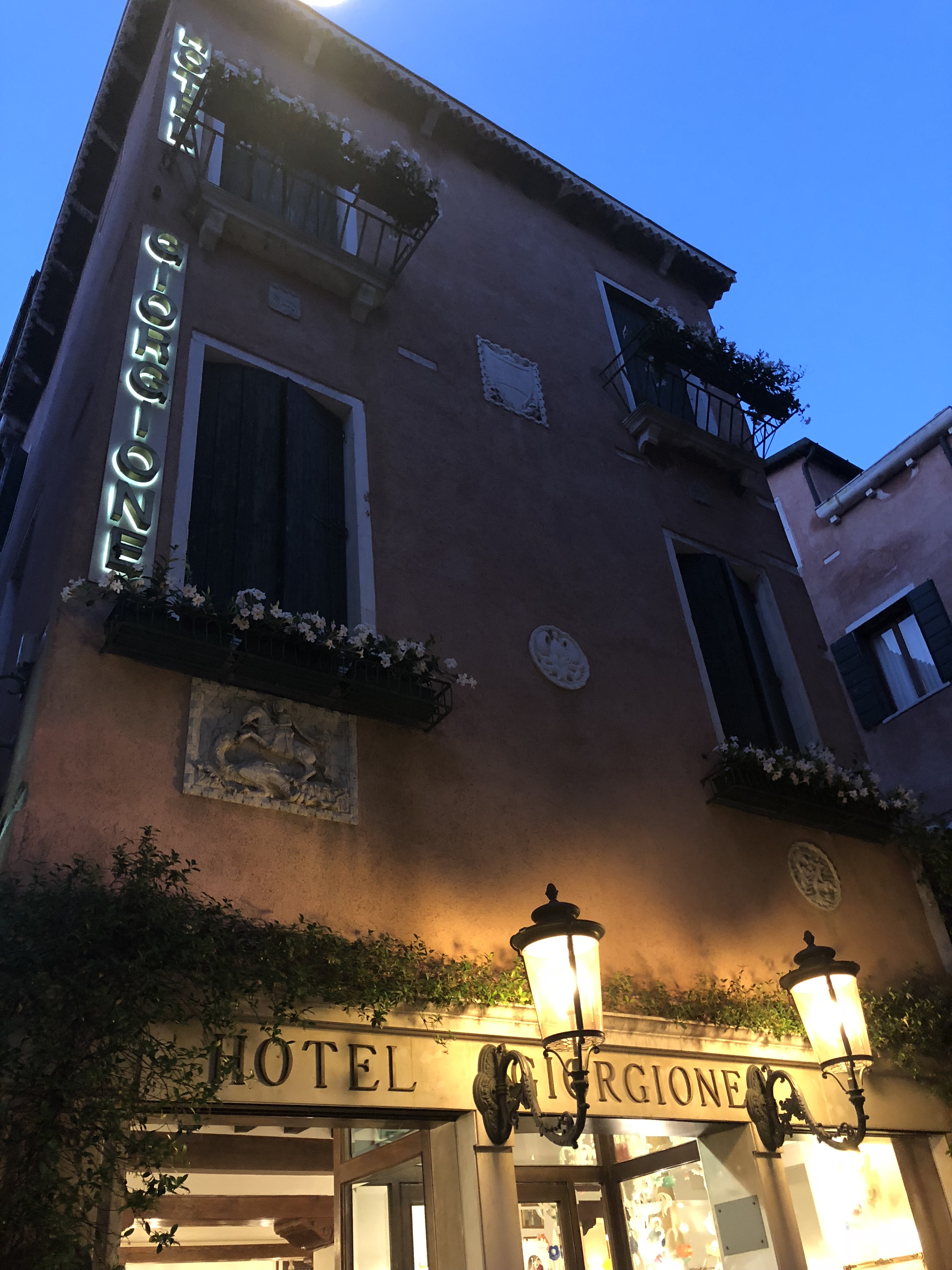 Upon arrival, we loved the look of the hotel, even from the street at 9pm at night. The hotel had a bright sign easily seen from down the street. The hotel decor inside is very nice with Murano glass pieces on display throughout. The paintings were original and added a upscale ambiance throughout the hotel. Our room had a Venetian feel with a lovely balcony of the narrow streets below. We had a comfortable stay and enjoyed coming back to this quiet oasis away from the hustle and bustle.